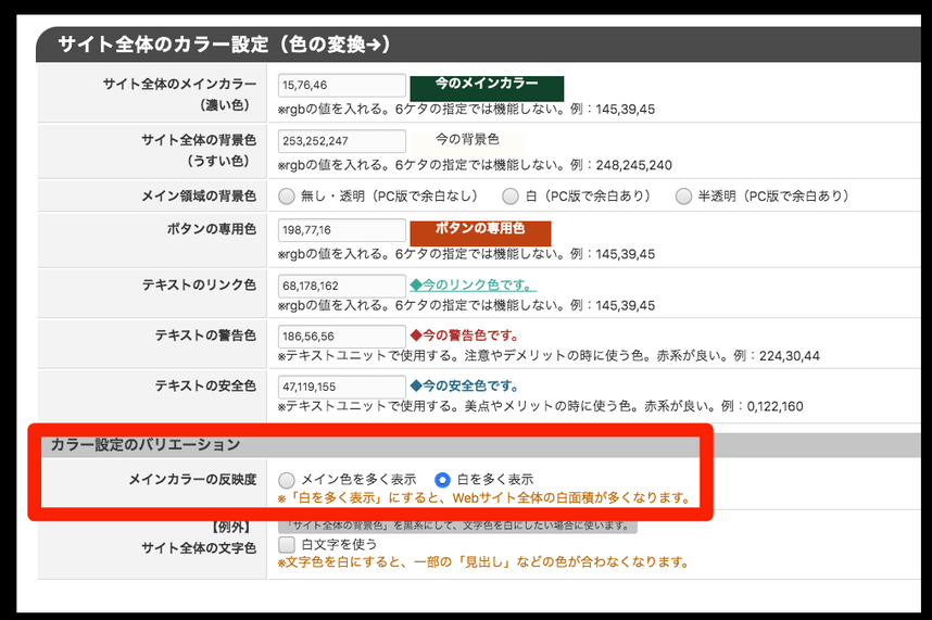 しかし、最近はトレンド的に白っぽいページが増えてきたので、ページ全体を白っぽくしたい時に使える機能をつけました。
