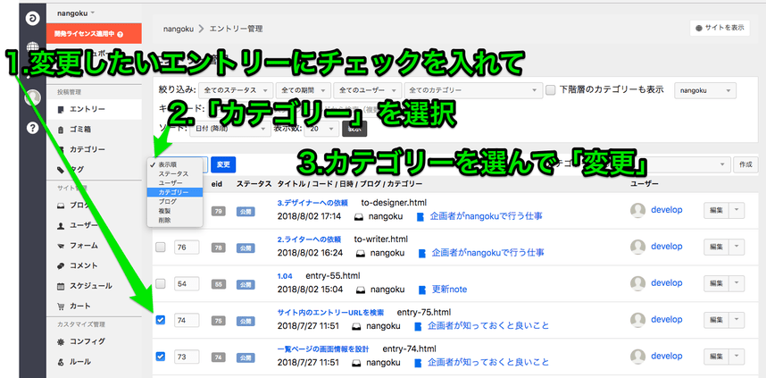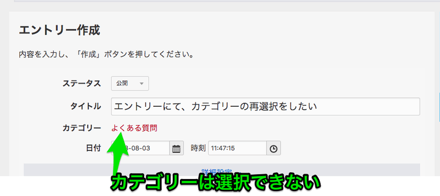 エントリーで「カテゴリーの再選択」をしたい nangokuでは、エントリー作成画面でカテゴリー選択をできないようにしています。 エントリーのカテゴリーを再選択する方法 管理ページ → エントリー から、カテゴリーを再選択できます。 カテゴリー選択できない理由 更新ユーザーさん(お客様)の誤操作を防ぐため カテゴリー変更によって、作成画面のカスタムフィールドに影響が出るため ・・・という理由で、この仕様になっています。