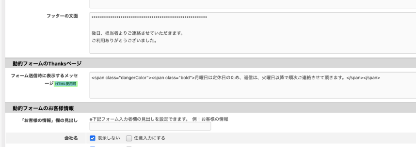 動的フォーム、送信後に表示するメッセージにて、タグを使用可能にした。
