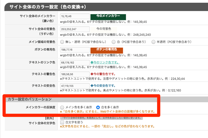 サイト全体の「ビジュアル」設定に「メインカラーの反映度」を追加。