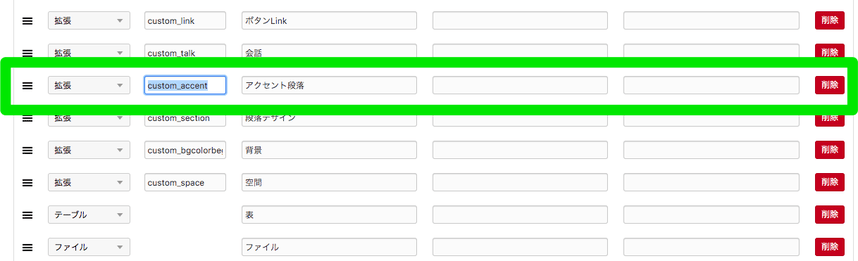 テーマ コンフィグ 3.06 カスタムユニットを1つ追加しただけなので、コンフィグに手入力でユニット追加すれば使用可能。 コンフィグのインポートする必要なし。 コンフィグの編集設定で、custom_accentを追加して保存。 次にユニット設定で、カスタムユニットのアクセント段落を追加して保存。 これでOK。 アクセント段落ユニットを新設 今まで「段落デザイン」や「背景」のユニットで実現していた表現が、このユニットで一元管理可能。 詳細は後日ドキュメント作成予定。