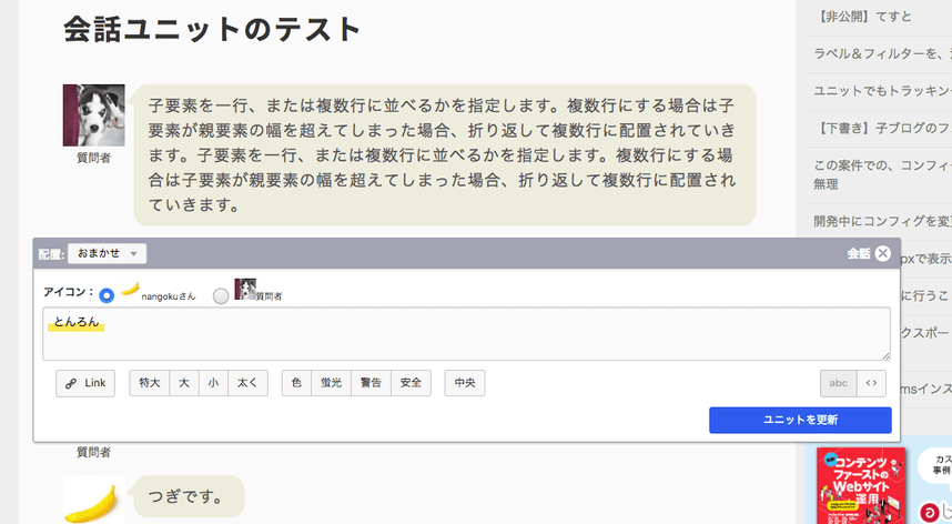 テーマ コンフィグ 1.08 コンフィグの変更記録、表示できなかったのでテーマを修正(id_fieldVersion.html) cssのp.custom_bgcolorendを変更 コンフィグ変更はカスタムユニット(custom_talk)だけ 会話ユニット追加 カスタムユニットcustom_talk http://banana.rou-co.com/bid/1/admin/blog_edit/#siteEntryでアイコンを設定