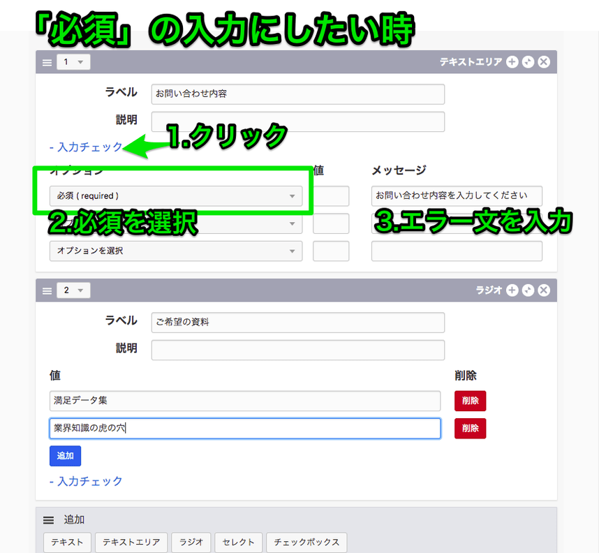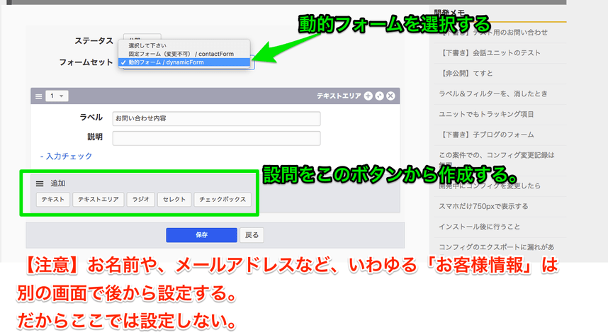 ・・・など、閲覧者がフォームを使ってやりたいことについて、設定します。