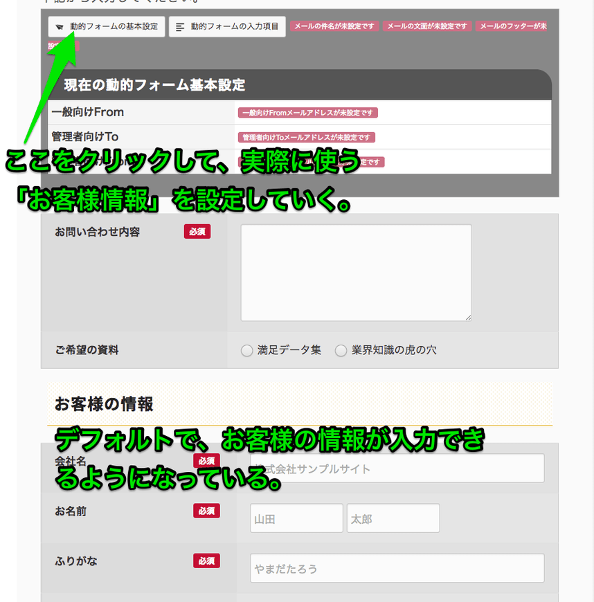 なお上記に無い「お客様情報」は、Web制作者がカスタマイズして付けることになります。