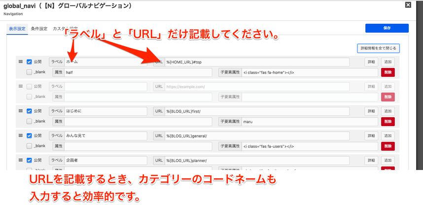 カテゴリー作成で入力した「コードネーム」をコピペして、ナビゲーションのURL欄にコピペしていきます。